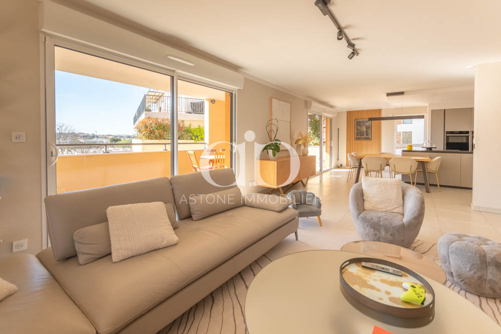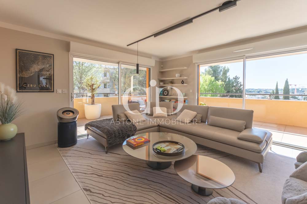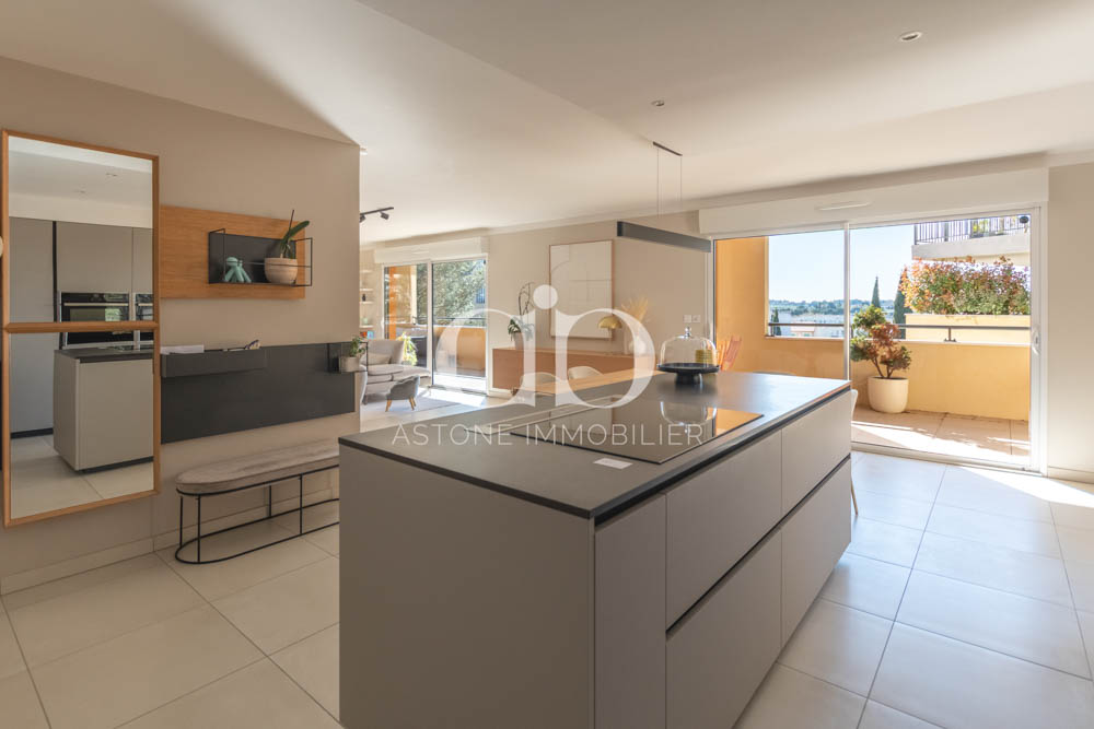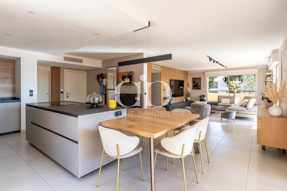Le séjour-cuisine ouvert de 63m² constitue le cœur de cet appartement aixois lumineux, bénéficiant d’une double exposition Sud et Ouest idéale.