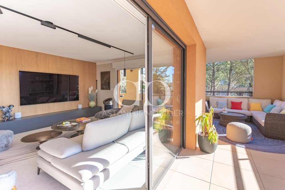 Dans une résidence sécurisée construite en 2022 avec concierge, piscine et ascenseurs, appartement de 3 pièces à vendre de 115 m² Carrez, situé en rez-de-chaussée surélevé (correspondant à un deuxième étage) avec accès direct sur une terrasse Sud-Ouest de 60 m².