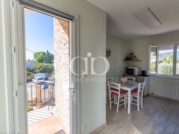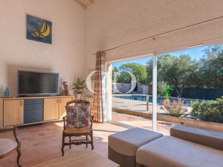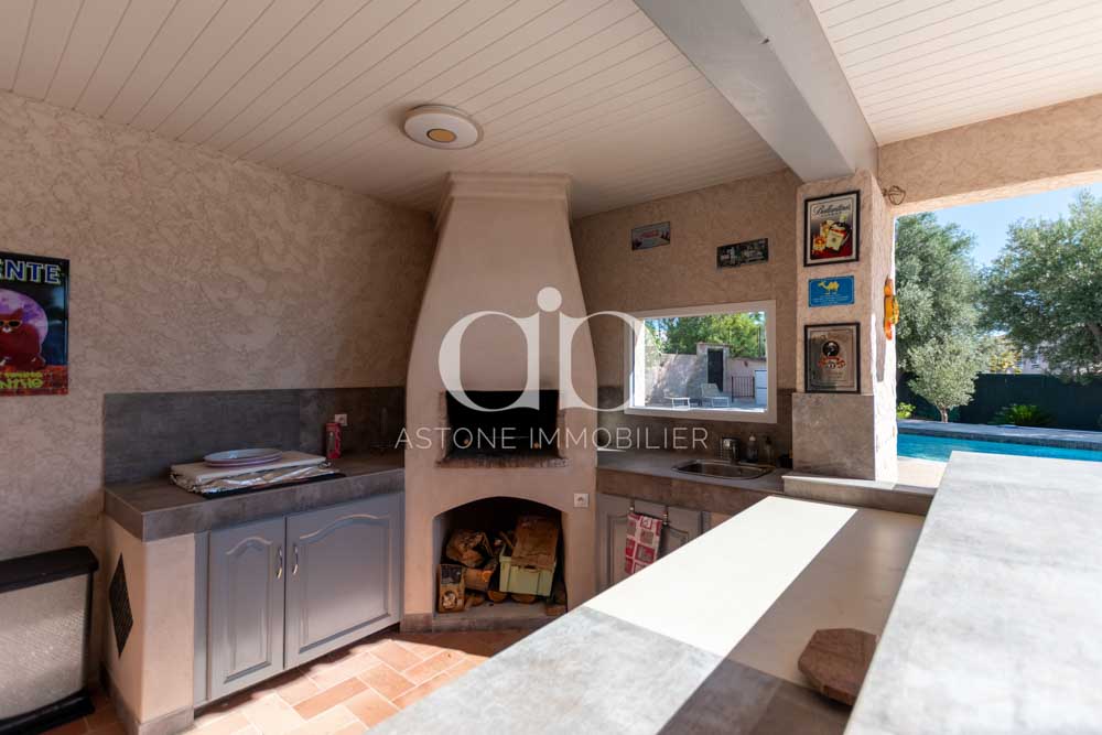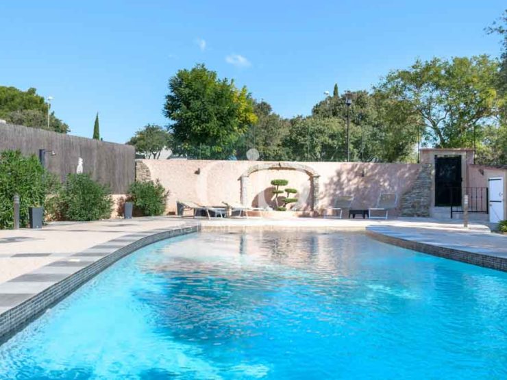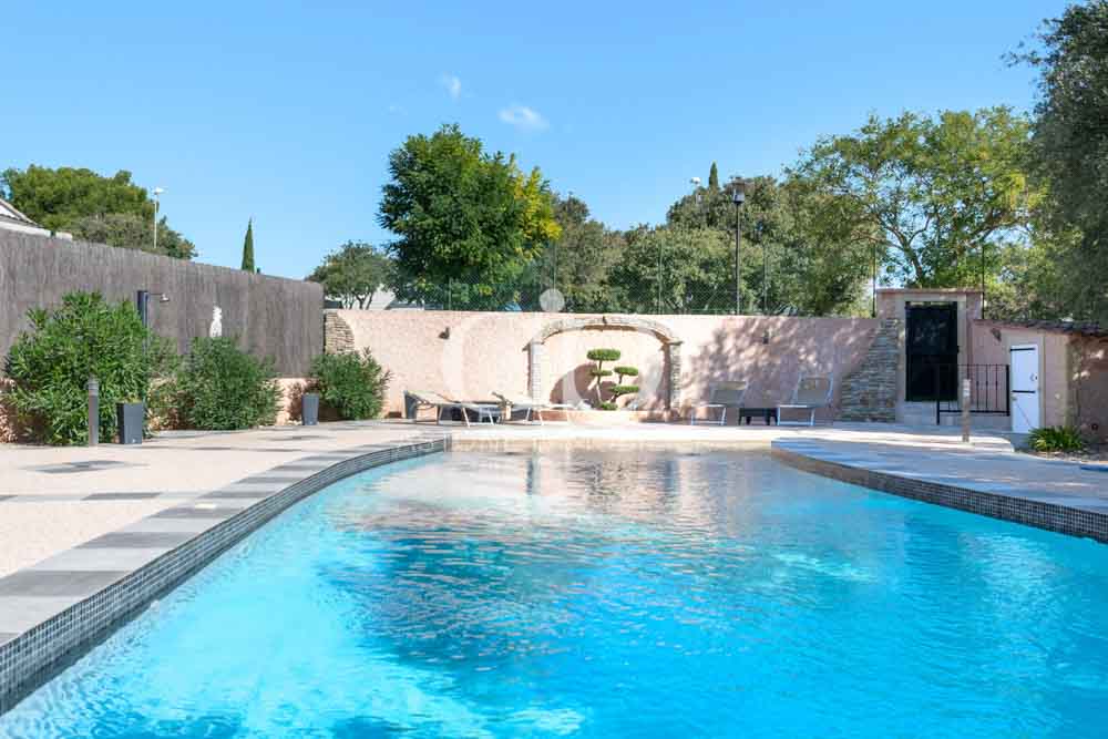 Dehors, à l’abri des regards, un très bel espace piscine avec autour un pool house avec four à pizza, une douche solaire. De l’autre côté de la maison, un jardin potager et un parking.